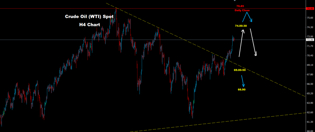 تمكن النفط الخام من اختراق مستوى المقاومة 71.00 حيث نصحنا قبل ذلك فوق هذه المستويات أن المزيد من التقدم نحو منطقة 30-74.00 قد يضرب السوق.
