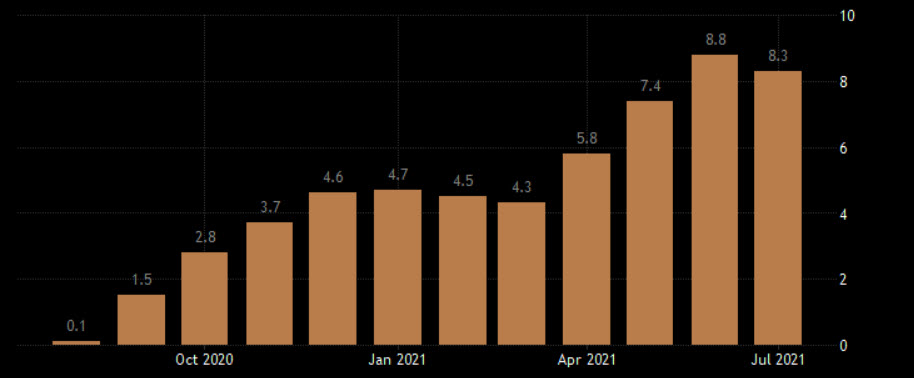 على صعيد آخر، لم يشهد سوق العمل التحسن الكامل مع استمرار ضعف زيادة الأجور والذي سجل ارتفاعاً بنسبة 8.3% على أساس سنوي خلال الثلاث شهور المنتهية في يوليو مقارنة بـ 8.8% سابقاً.