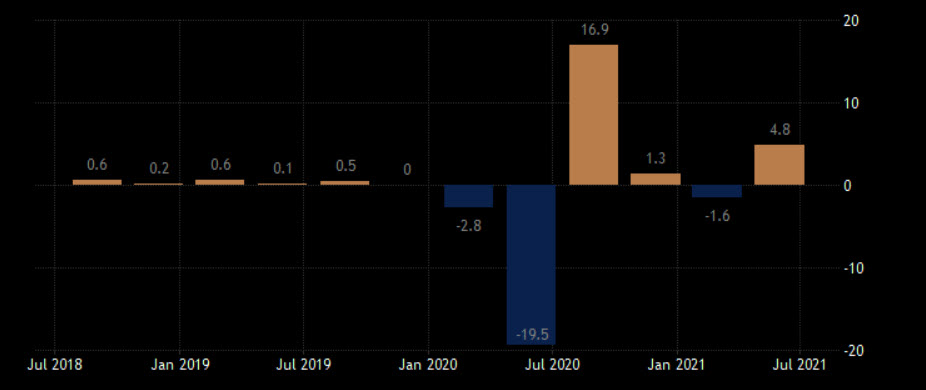 وعلى صعيد النمو الاقتصادي، سجل الناتج المحلي نمواً بنسبة 4.8% خلال الربع الثاني مقارنة بانكماشه خلال الربع الأول بنسبة -1.6%. وكان النمو الاقتصادي مدعوماً بزيادة إنفاق الأسر بنسبة 7.3% مقابل تراجعه بنسبة -4.6% خلال الربع الأسبق.