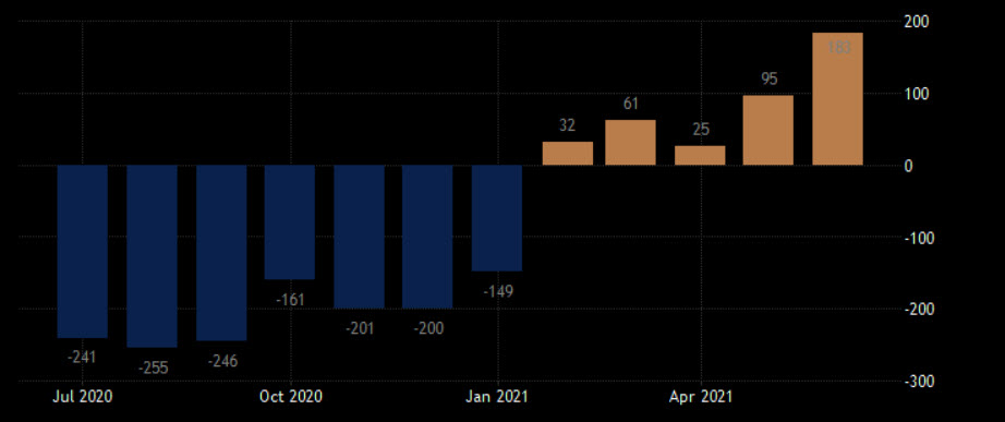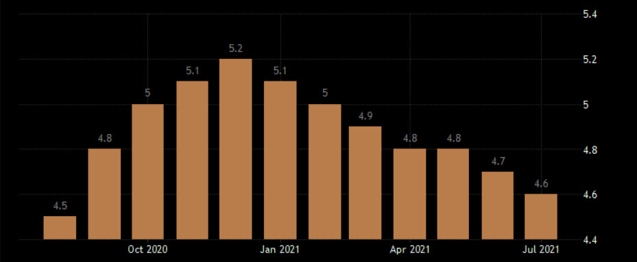 كما تراجعت معدلات البطالة إلى أدنى مستوى لها في عام إلى 4.6% خلال الثلاث شهور المنتهية في يوليو الماضي ولكنها لا تزال مرتفعة بنسبة 0.6% عن مستويات ما قبل أزمة كورونا.