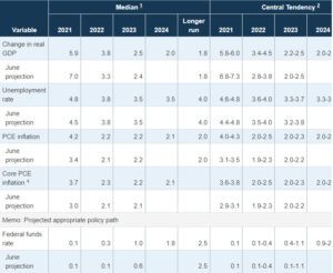 وعلى صعيد التضخم، يتوقع الفيدرالي أن يسجل التضخم ارتفاعات أقوى من المتوقع هذا العام على أن تعتدل وتيرة الارتفاع بمنتصف عام 2022، حيث يتوقع الفيدرالي ارتفاع التضخم بنسبة 4.2% بنهاية العام مقارنة بـ 3.4% بتوقعات شهر يونيو وأن تصل وتيرة الارتفاع إلى 2.2% العام المقبل.
