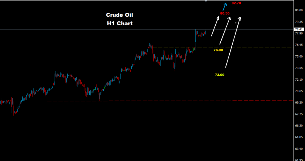 تمكن النفط الخام من اختراق المقاومة 77.00 حيث نصحنا قبل ذلك إنه وفوق هذا المستوى من المتوقع حدوث مزيداً من التقدم نحو المقاومة 78.50 و80.00.