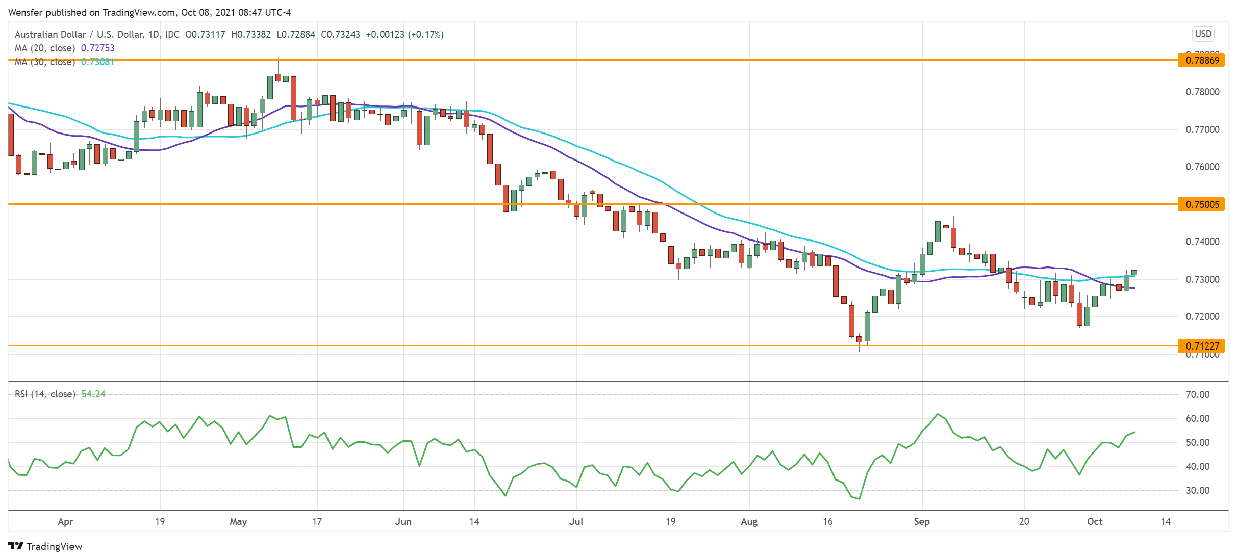 وبات التطعيم هو أساس العودة إلى الوضع الطبيعي. وتتوقع الأسواق أن يحذو البنك المركزي حذوه في إعادة سياسته النقدية إلى ما كانت عليه قبل الجائحة، لا سيما أن جاره بنك الاحتياطي النيوزيلندي قد اتخذ اولى قراراته في رفع الفائدة. ويمثل المستوى ٠.٧٥٠٠ مقاومة رئيسية ويمثل المستوى ٠.٧١٢٠ مستوي الدعم اللازم ثباته لإبقاء الزوج صامداً.