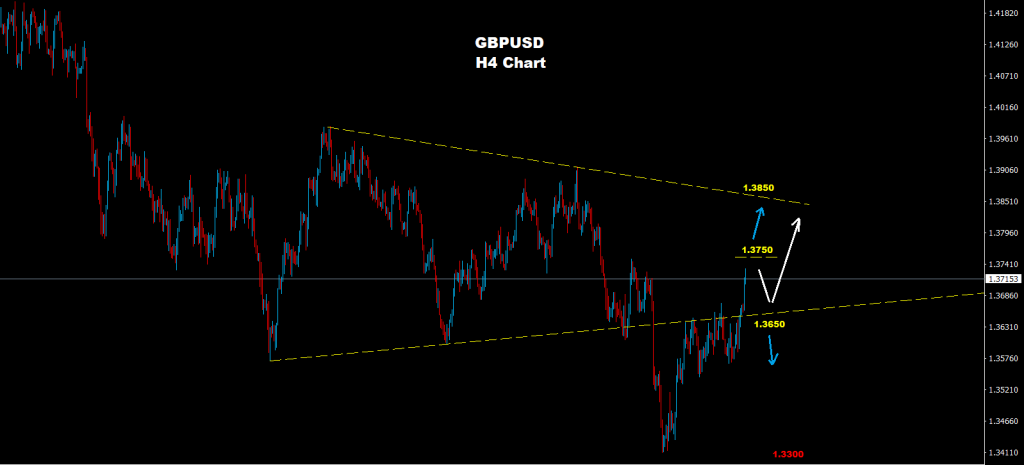 إذا فشل السوق في الاختراق فوق 1.3750، فقد يتجه لتراجع مرة أخرى لاختبار 1.3650  قبل استمرار الموجة المتقدمة نحو 1.3850