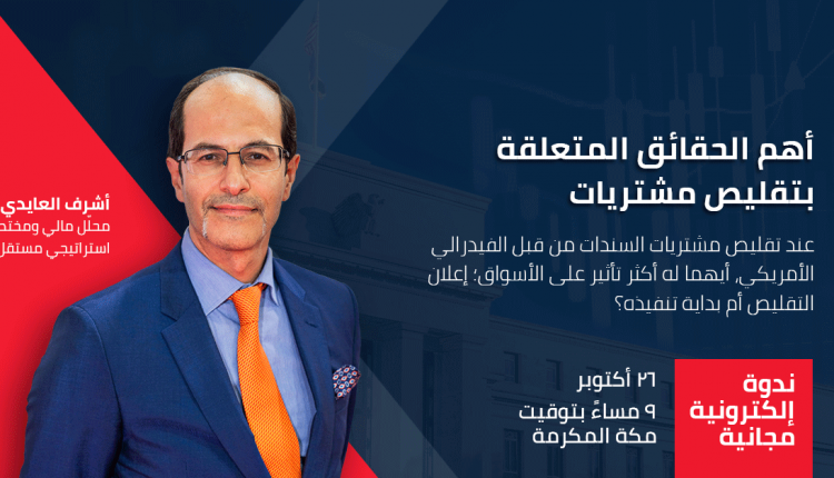عند تقليص مشتريات السندات من قبل الفيدرالي الأمريكي، أيهما له أكثر تأثير على الأسواق؛ إعلان التقليص أم بداية تنفيذه؟ وهل سيتزامن بداية التقليص مع هبوط الذهب مثلما شاهدنا عام ٢٠١٤؟ ماذا نتوقع هذه المرة، ولماذا؟ وهل سيتمكن الفيدرالي من إكمال برنامج التقليص؟ التفاصيل مع خبير الأسواق العالمية أشرف العايدي في هذه الندوة الالكترونيّة
