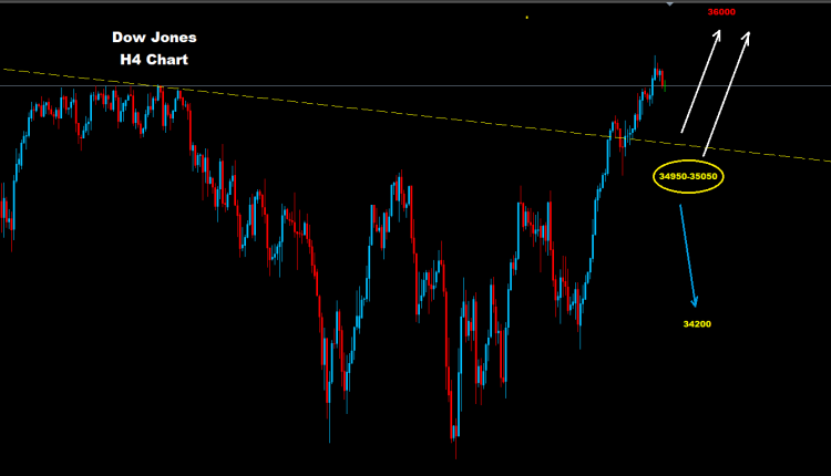 كما نرى على الرسم البياني، يواجه السوق الآن منطقة دعم حول 34950-35050 حيث طالما استمر السوق بالحفاظ على تداولاته فوقها فإن موجة متقدمة أخرى باتجاه 36000 وما فوق سيكون متوقعاً.