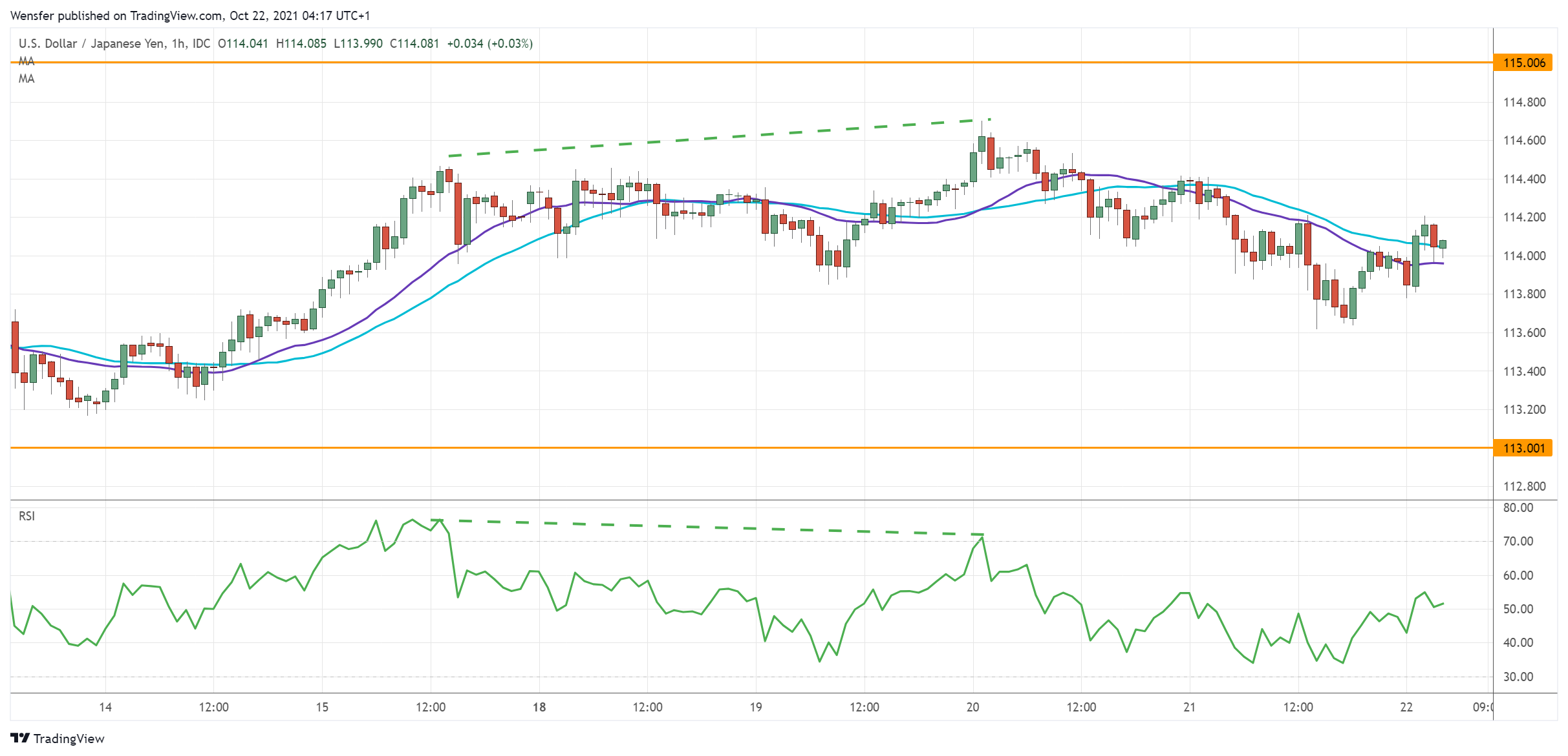 ورغم معاناة الزوج لتجاوز المستوى النفسي ١١٥.٠٠، والتي من المحتمل أن يكون فرط الارتفاع هو سببها، إلا أن المعنويات تبقى إيجابية. هذا ويشير كل من القمة المزدوجة لمؤشر القوة النسبية في منطقة ذروة الشراء والانحراف السلبي إلى أن الارتفاع قد يفقد قوته.