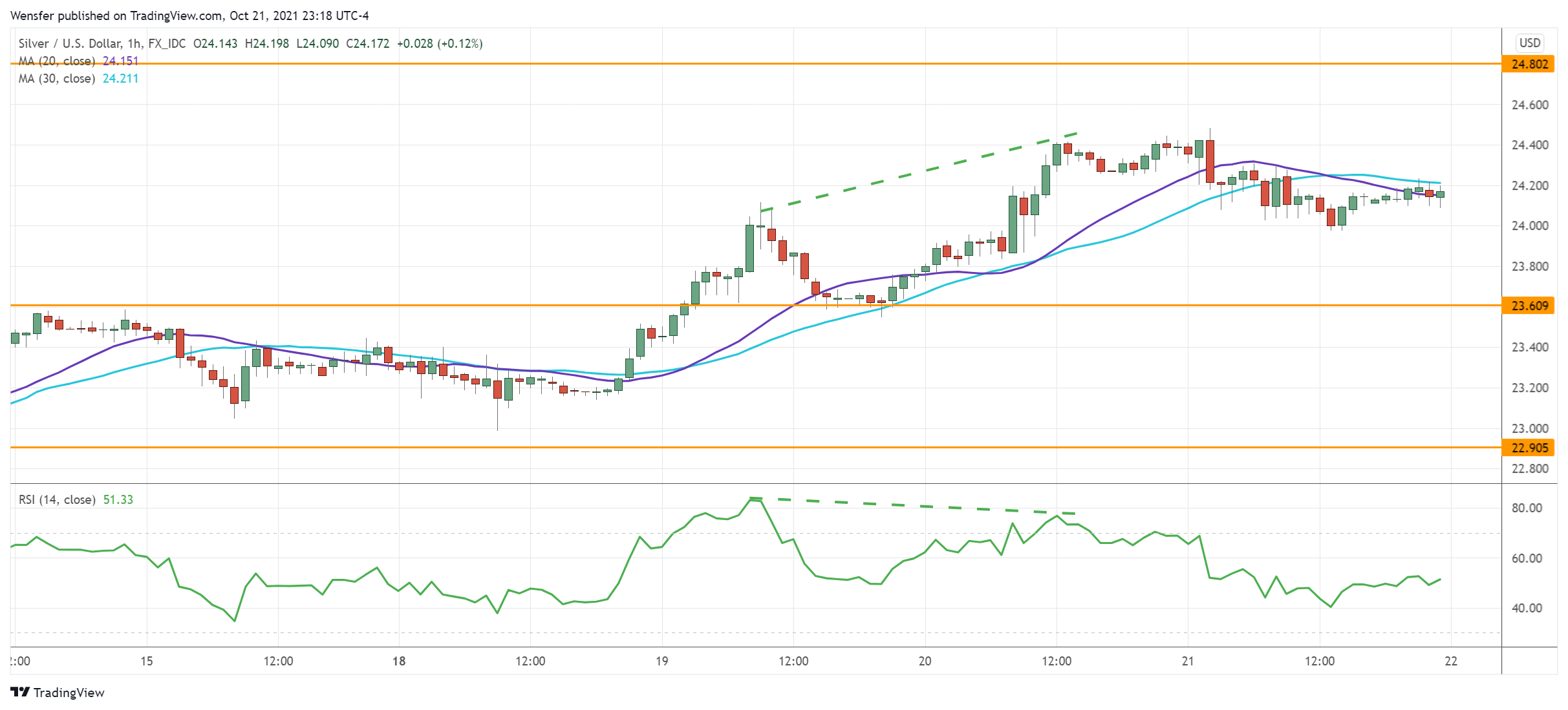 يتوقف ارتفاع الفضة في وقت يعوض فيه الدولار الأمريكي بعضاً من خسائره. ويدل الاختراق أعلى المستوى ٢٤.٠٠ على التزام قوي من قبل جانب الشراء.