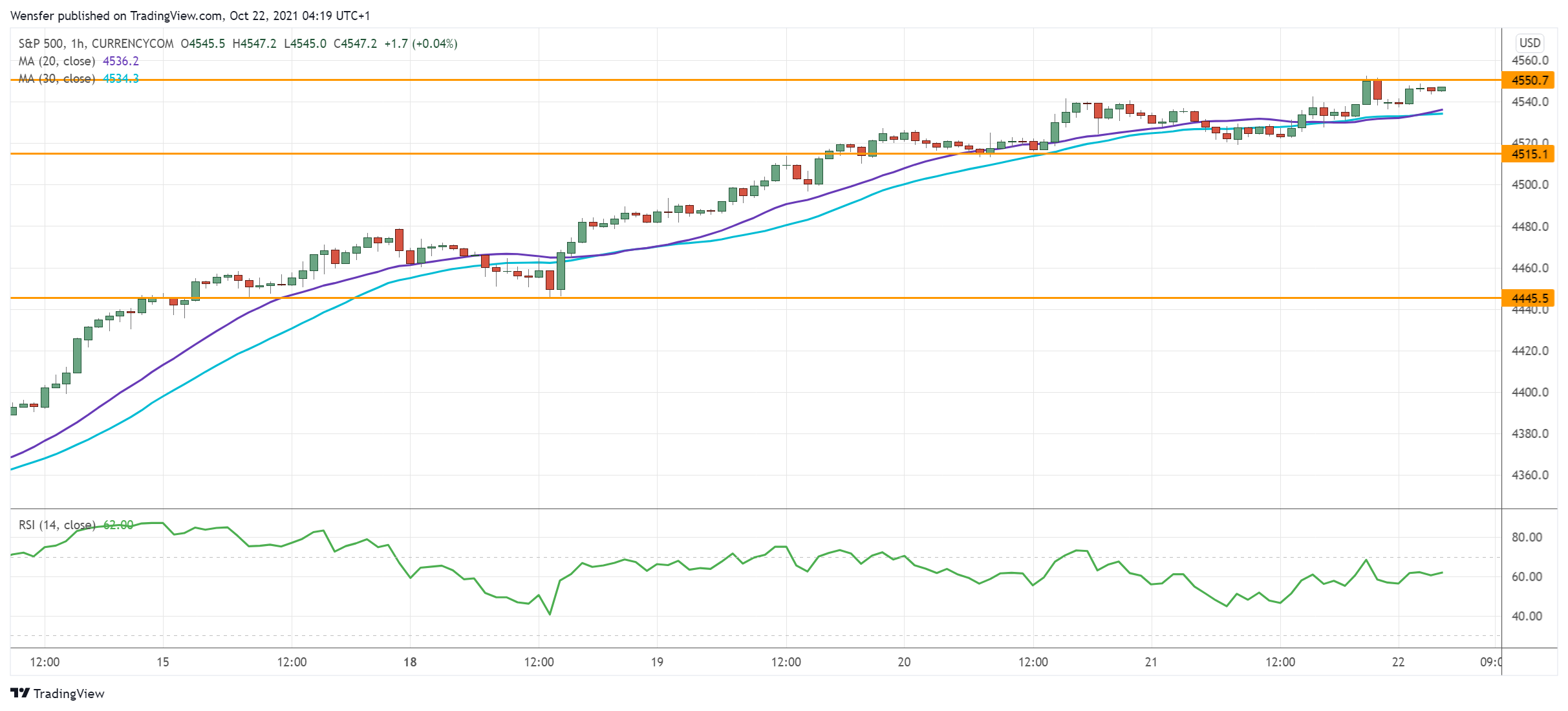 وقد يتراجع التزام المشترين بصفقاتهم في حال الانخفاض ما دون مستوى الدعم المباشر عند ٤٥١٥. وسيكون مستوى الدعم التالي عند ٤٤٤٥ والذي يتزامن مع المستوى ٣٨.٢٪ من تصحيح فيبوناتشي لمسيرة ارتفاع شهر أكتوبر. ويتوقع أن يشتري داعمي الارتفاع الانخفاضات رغم التراجع بعد أن أصبحت المعنويات متفائلة.