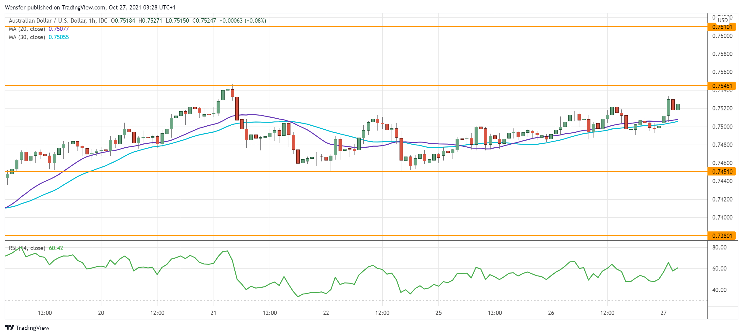 وعلى الجانب الهابط، نجد أن حال تعمق الارتداد فإن الزوج سيختبر منطقة الطلب الواقعة بين ٠.٧٣٨٠ والمستوى النفسي ٠.٧٤٠٠.