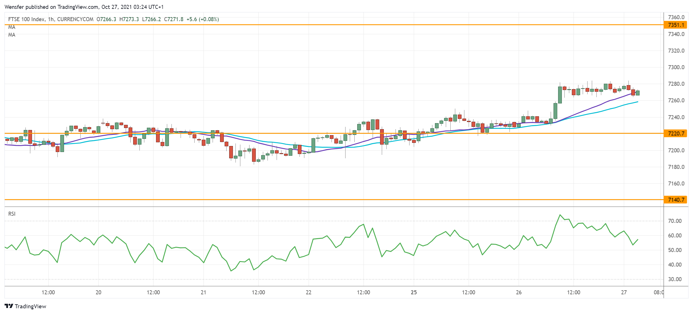 اخترق مؤشر فوتسي ١٠٠ نحو الأعلى مع تزايد الثقة في أعقاب تحقيق ارتفاعات جديدة في وول ستريت. ويعتبر تجاوز أعلى مستوى مسجل في شهر أغسطس عند ٧٢٢٠ مؤشراً على الالتزام القوي من جانب الشراء.