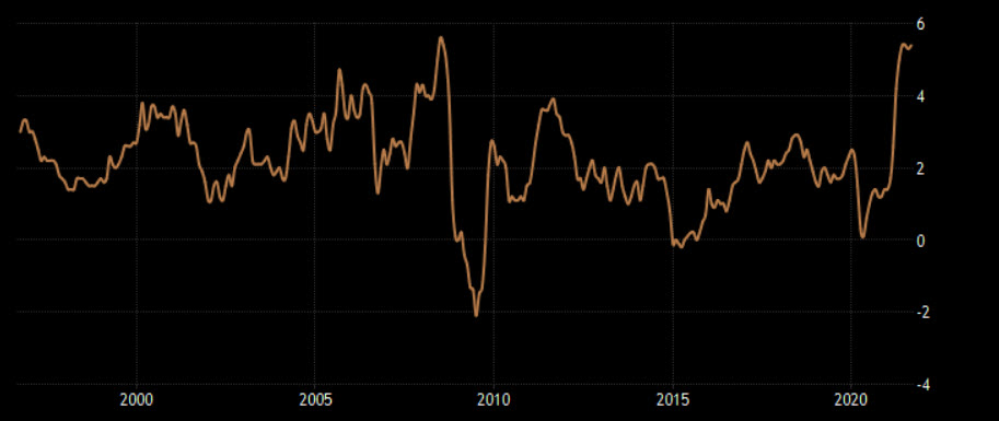 وأعزى الأعضاء توقعاتهم باستمرار ارتفاع التضخم بسبب مشاكل سلاسل الامدادات ونقص العمالة، وبدا ذلك واضحاً في ارتفاع التضخم السنوي بنسبة 5.4% على أساس سنوي خلال الشهر الماضي وهو أعلى مستوى له في 13 أعوام.