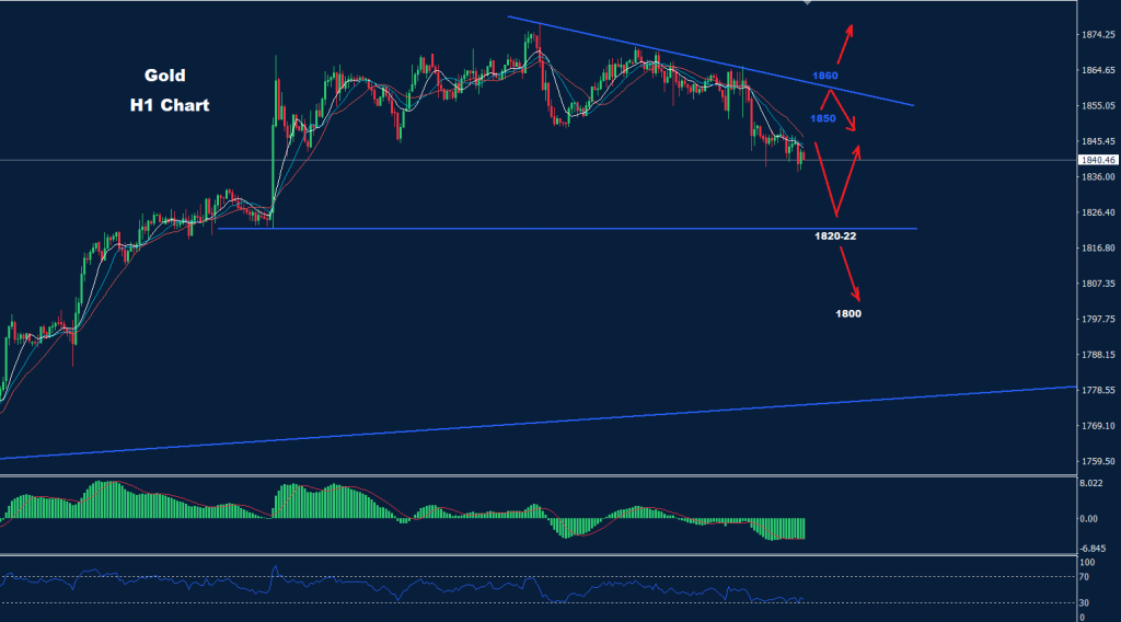 كما نرى على الرسم البياني، تظهر المستويات خلال اليوم مقاومة حول 1850 و 1860 حيث طالما استمر السوق في الاحتفاظ بالتداولات دون أحد تلك المقاومات، فمن المتوقع حدوث انخفاض آخر نحو منطقة 22-1820.