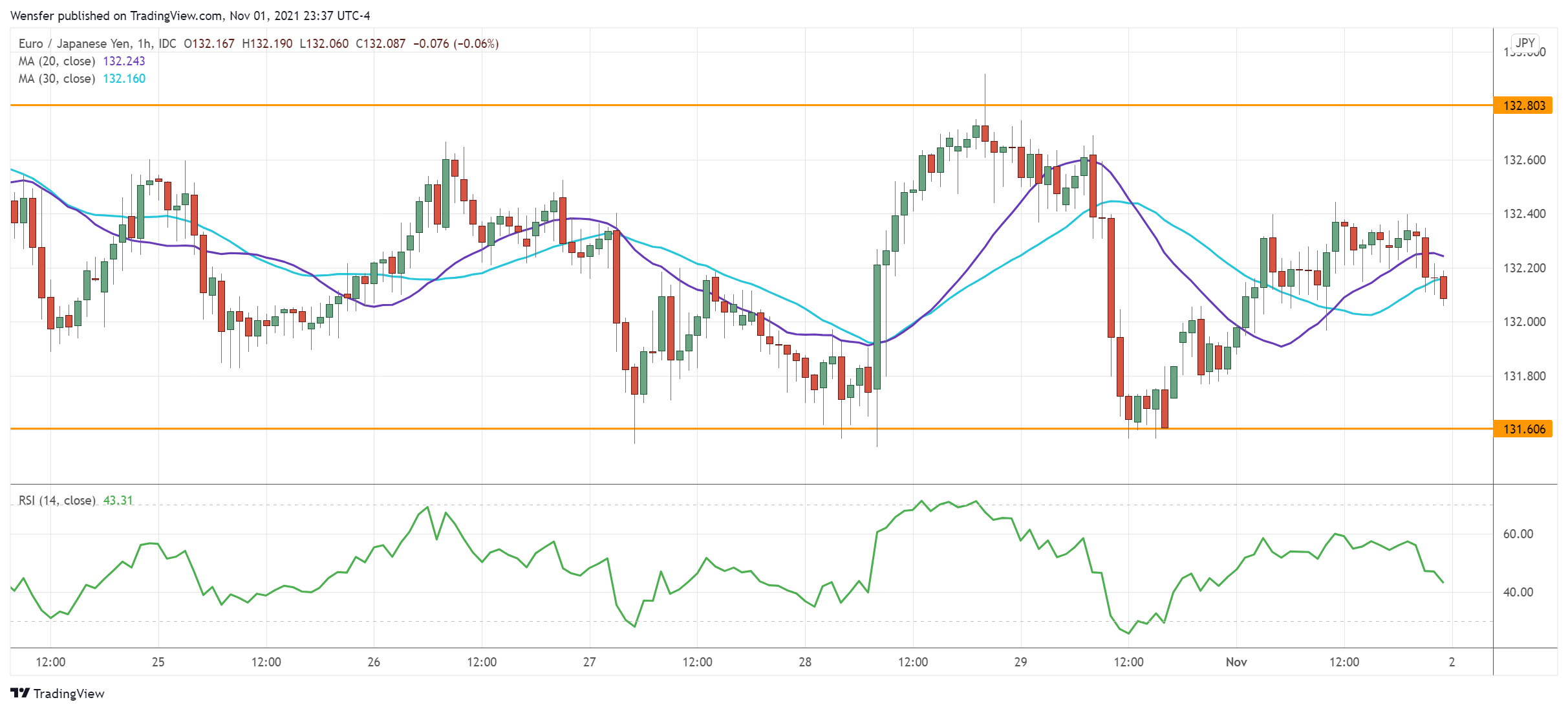 وعلى الجانب الهابط، نجد أن الاختراق السلبي سيوسع من الحركة العرضية نحو السعر ١٣٠.٨٠ والذي يقع في المتوسط المتحرك لمدة ٣٠ يوماً.