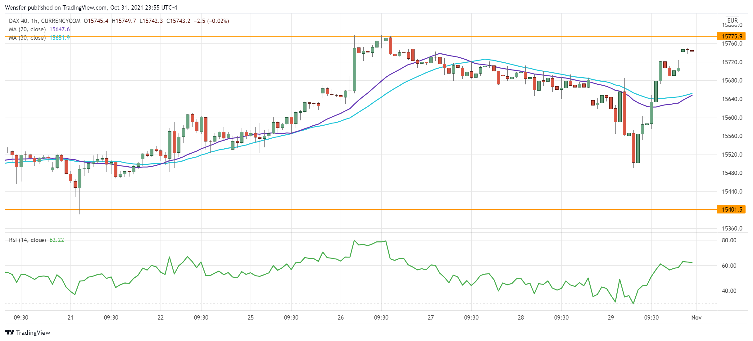 ويعتبر التقاطع الإيجابي للمتوسط المتحرك على الرسم البياني اليومي دليلاً على الانتعاش. وهذا على الرغم من تعثر المؤشر عند السعر ١٥٧٧٥، وهو مستوى مقاومة رئيسي من عمليات البيع المكثفة التي تمت في سبتمبر الماضي.