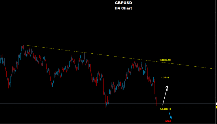 تحت 1.3400 فإن مزيداً من الانخفاض نحو 1.3300 وربما 1.3190 قد يضرب  السوق.