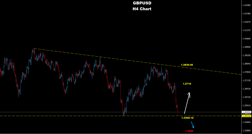 تحت 1.3400 فإن مزيداً من الانخفاض نحو 1.3300 وربما 1.3190 قد يضرب  السوق.