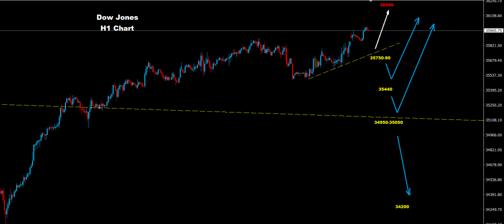 وتحت 35750 قد يضرب المزيد من الهبوط السوق حيث يوجد دعم آخر عند 35440 والذي بدوره قد ينشط هذه الموجة المتقدمة نحو 36500.