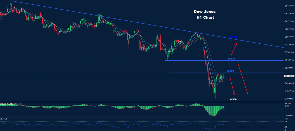 كما نرى على الرسم البياني، يواجه مؤشر الداو الآن مقاومة خلال اليوم حول 35200 بينما توجد مقاومة أخرى عند 35420 حيث طالما استمر السوق في الحفاظ على التداولات أسفل إحدى تلك المقاومات، فمن المتوقع حدوث موجة هبوط أخرى باتجاه 34500.