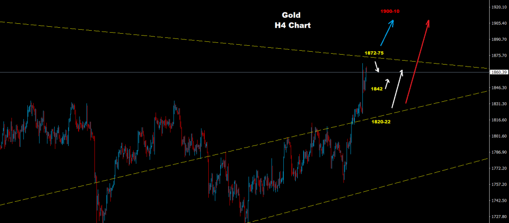 تمكن الذهب من اختراق المقاومة 1835 حيث تمكن من إضافة المزيد من التقدم نحو منطقة الهدف الثاني 65-1860.