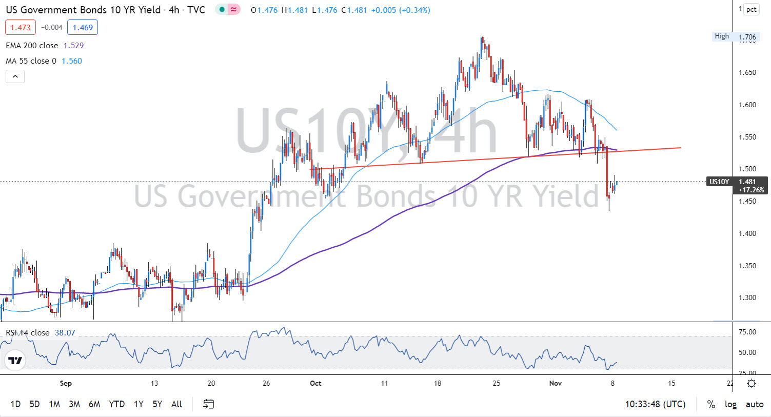 أظهر سوق العمل الأمريكي المزيد من التعافي خلال شهر أكتوبر بإضافة القطاع غير الزراعي 531 ألف وظيفة مقابل التوقعات التي أشارت إلى 455 ألف وظيفة. بالإضافة إلى تراجع معدلات البطالة من 4.8% إلى 4.6%، وارتفاع الأجور على أساس شهري بنسبة 0.4%.