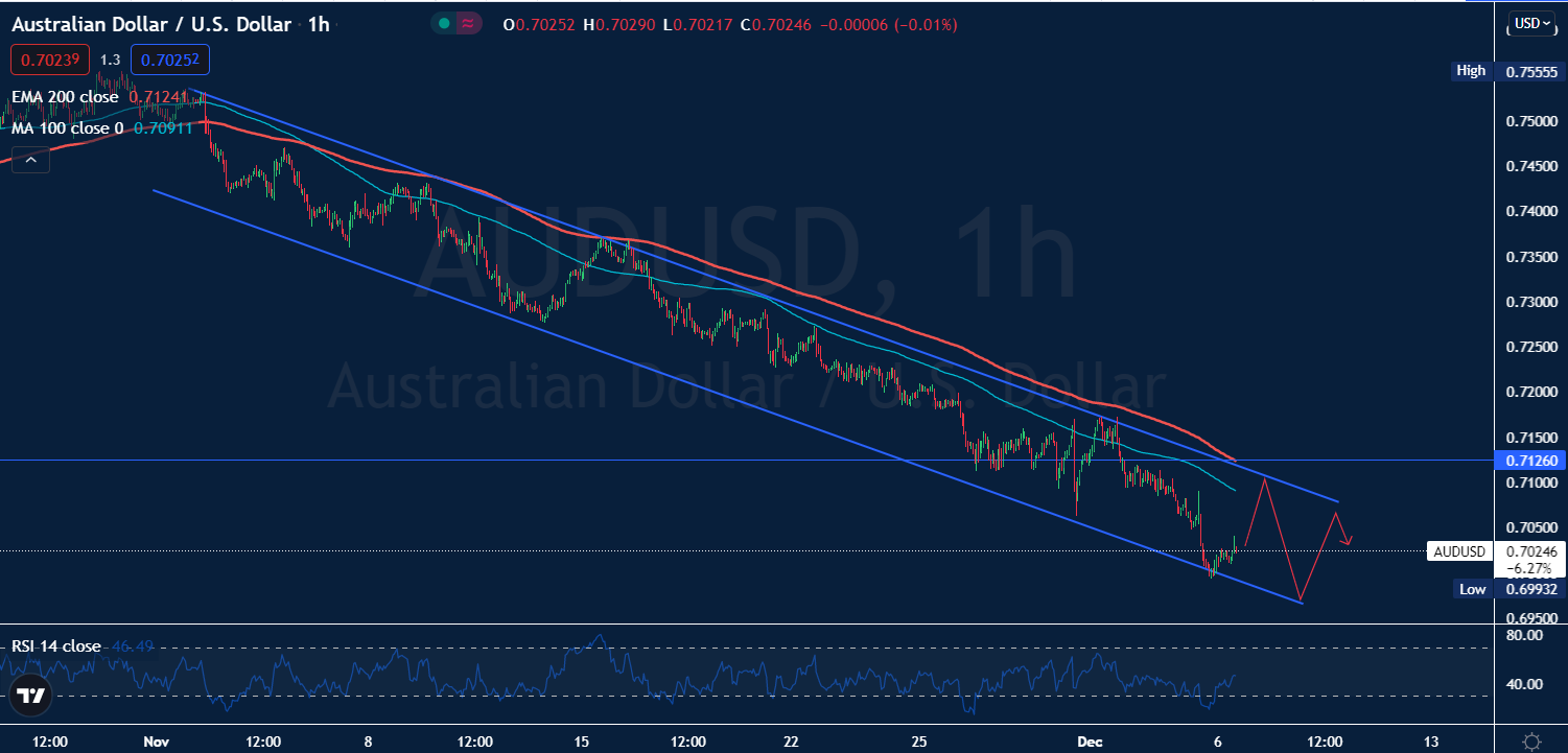 ويشكل نطاق المستوى 0.7125 مقاومة قوية يتم استغلالها لبناء تمركزات بيعية على المدى القصير، ويعتمد ذلك على قرارات الاحتياطي الأسترالي غداً.