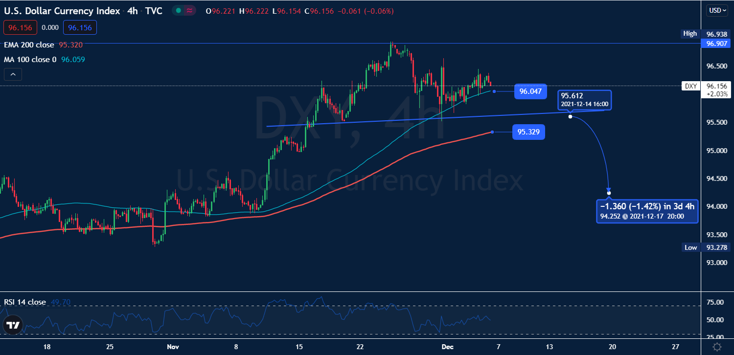 يجري تداول الدولار أعلى المتوسط المتحرك 100 على الإطار الزمني 4 ساعات قرابة 96.00 مما يدعم النظرة الشرائية على المدى المتوسط، أما في حال كسره فمن المتوقع أن يوفر المتوسط المتحرك 200 دعمًا عند المستوى 95.30.