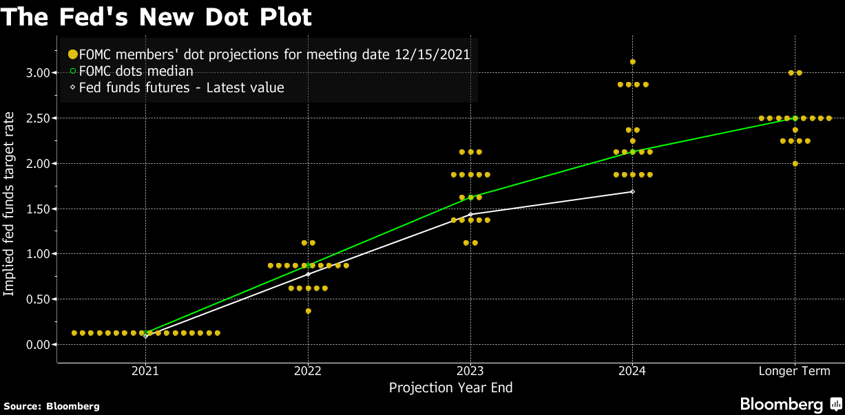 أظهر مخطط توقعات الأعضاء لمستويات الفائدة أو ما يعرف بالـ Dot Plot أن أغلب الأعضاء يتوقعون رفع الفائدة ثلاث مرات في 2022 وثلاث مرات في 2023.