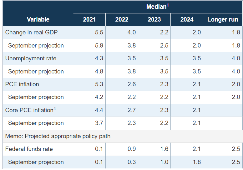 وحسب التوقعات الاقتصادية، رفع الفيدرالي الأمريكي توقعاته لمعدلات التضخم لعام 2022 من 2.2% خلال اجتماع سبتمبر إلى 2.6% ولعام 2023 من 2.2% إلى 2.3% وخفض توقعاته لمعدلات البطالة لعام 2022 من 3.8% إلى 3.5%، مما يشير إلى ثقة الأعضاء في استمرار التعافي الاقتصادي والاستمرار في تشديد السياسة النقدية العام المقبل.