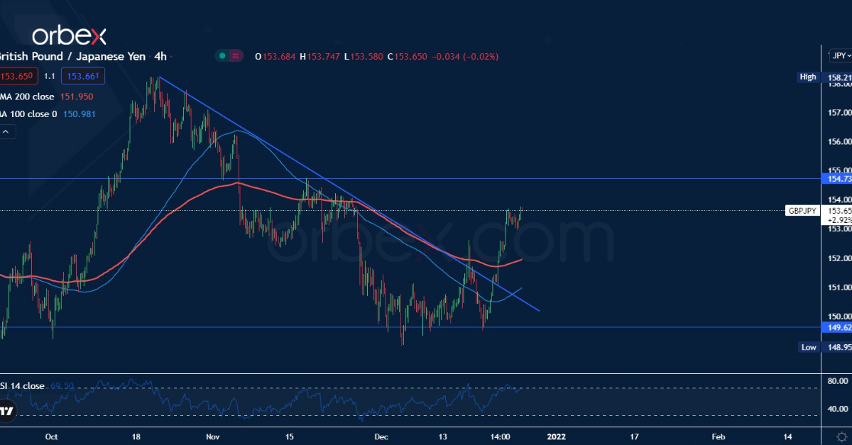 من المتوقع أن يواصل الزوج ارتفاعه إلى المستوى 154.73 بعد كسر خط الاتجاه الهابط والمتوسط المتحرك 200 على الإطار الزمني 4 ساعات.