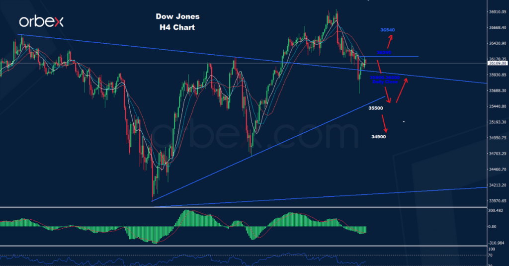 تمكن مؤشر الداو من الهبوط دون مستوى الدعم 35900-36000 أمس بينما تمكن من الحصول على الإغلاق اليومي فوقه مرة أخرى، مما وضع إشارات متضاربة على السوق.