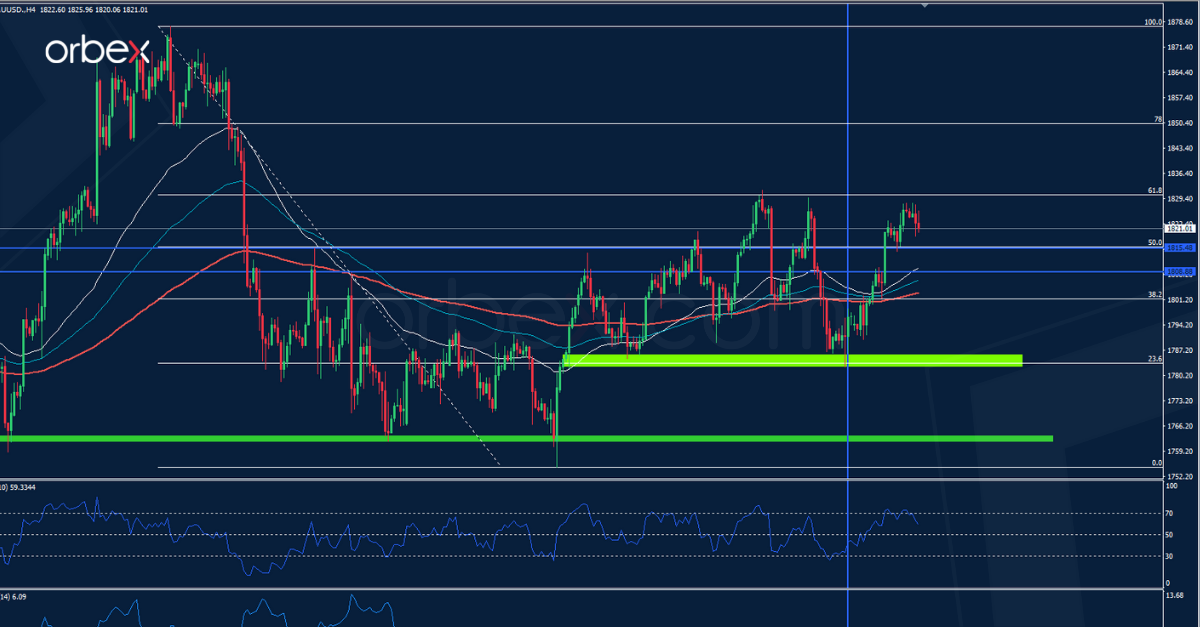 من ناحية أخرى، ارتفعت أسعار الذهب صوب مستوى المقاومة 1830$ بعد مجيء بيانات التضخم أعلى من المتوقع، ولكن فشل الذهب في اختراق النطاق 1830/35$ قد يزيد من الضغوط البيعية عليه لاستهداف المستوى 1790$ مرة أخرى.