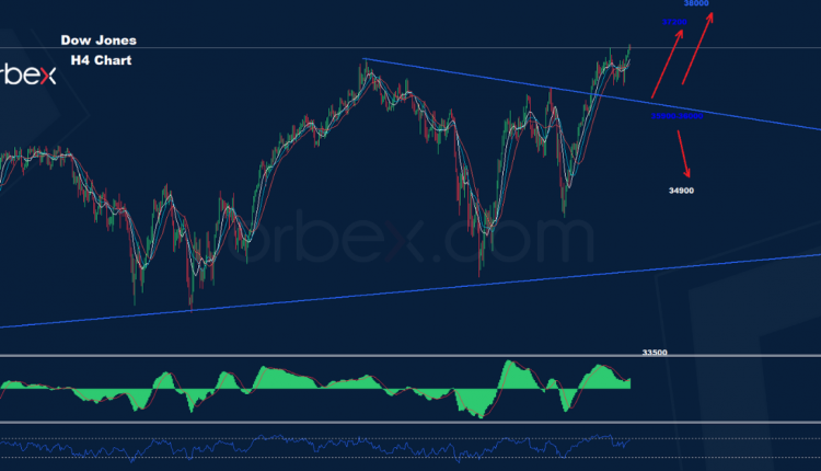 كما نرى على الرسم البياني، يظهر المدى القصير دعماً رئيسياً حول منطقة 35900-36000 حيث طالما استمر السوق في الحفاظ على الإغلاق اليومي فوق هذه المنطقة، فمن المتوقع حدوث تقدم أكبر نحو 37200 و 38000.