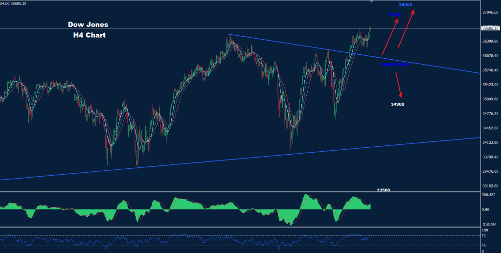 كما نرى على الرسم البياني، يُظهر المدى القصير دعماً رئيسياً حول منطقة 35900-36000 حيث طالما استمر السوق في الحفاظ على الإغلاق اليومي فوق هذه المنطقة، فمن المتوقع حدوث تقدم أكبر نحو 37200 و 38000.