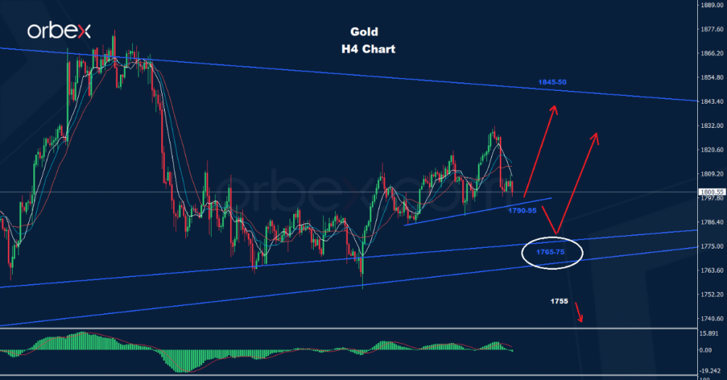 كما نرى على الرسم البياني، يواجه السوق الدعم حول 95-1790 والذي قد يوفر فرصة لتقدم آخر نحو منطقة 50-1845.