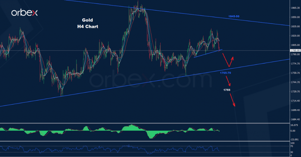 كما نرى على الرسم البياني ، نتوقع المزيد من الانخفاض لاختبار منطقة 70-1765 والتي بدورها قد تدفع باتجاه بعض التصحيح الارتدادي