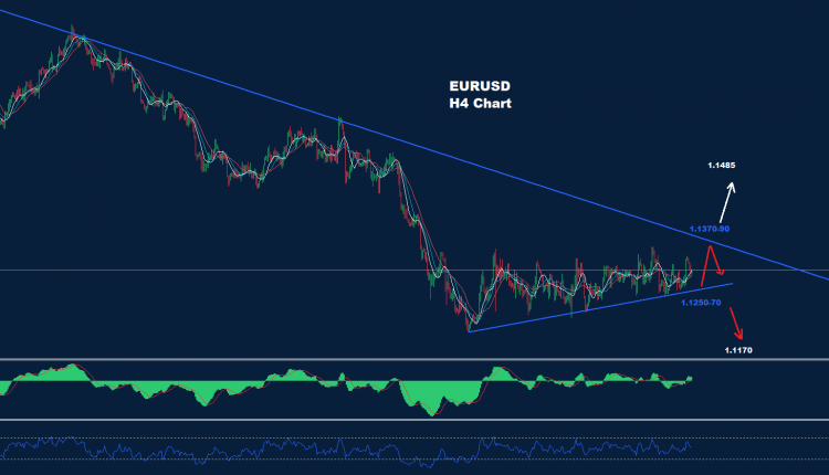 كما نرى على الرسم البياني، فإن السوق الآن داخل تشكيل مثلث تداولي حيث يوجد الدعم حول 1.1270 والمقاومة حول 1.1390.