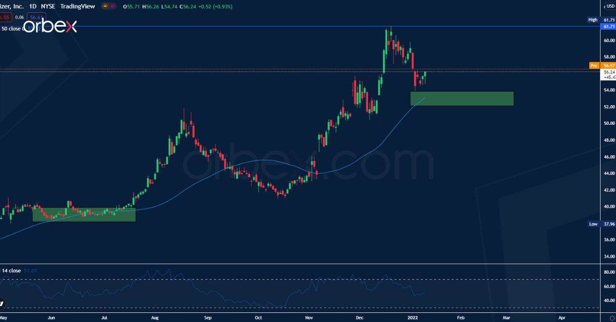 ولكن بالرغم من إيجابية البيانات، إلا أن سهم فايزر قد هبط بنحو 4% ولكن السهم لا يزال فوق المتوسط المتحرك لـ 50 يوم من الناحية الفنية، مما يدعم استمرار النظرة الشرائية للسهم. وعادة ما يتم بناء تمركزات شرائية على السهم كلما اقترب واختبر السعر هذا المتوسط.