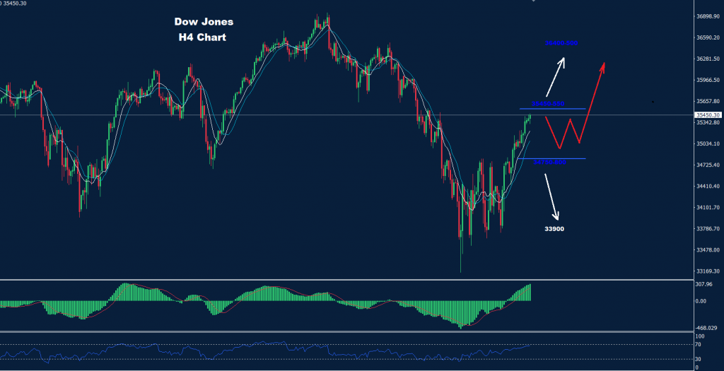 كما نرى في الرسم البياني، قد يتجه السوق إلى منطقة تداول بين المقاومة 550-35450 والدعم 34900.