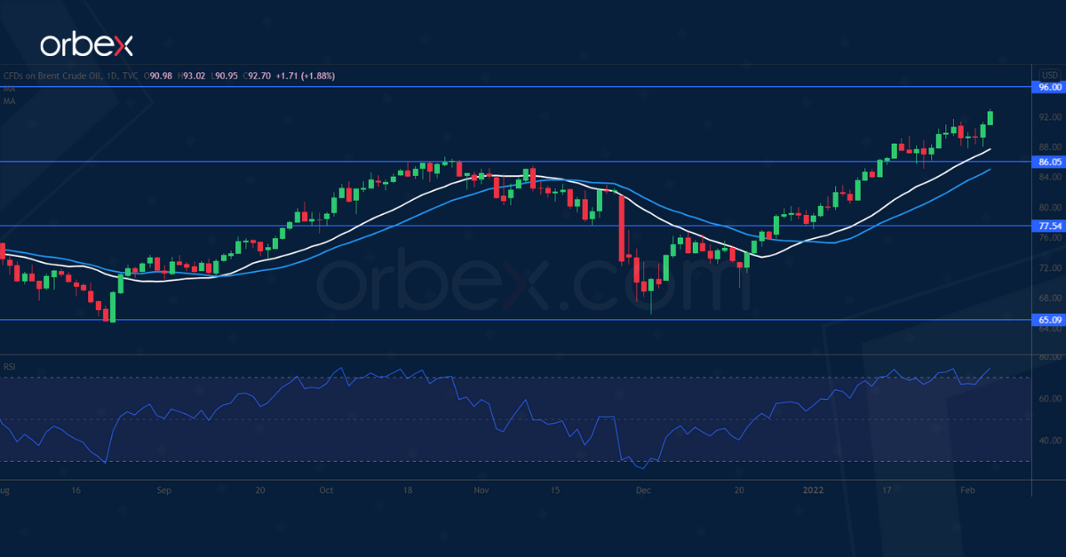 هذا وتزيد المواجهة بين روسيا والغرب في أوكرانيا في ذات الوقت من أسعار النفط نتيجة المخاوف التي تزداد بشأن حدوث أزمة طاقة في أوروبا. ويتجه خام برنت نحو ٩٦.٠٠، فيما يمثل السعر ٨٦.٠٠ أقرب مستوى دعم في حالة التراجع.