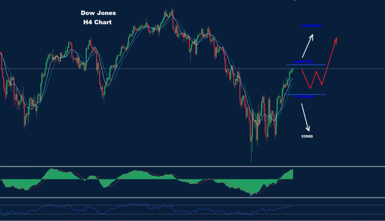 كما نرى في الرسم البياني، قد يتجه السوق إلى منطقة تداول بين المقاومة 550-35450 والدعم 34900.