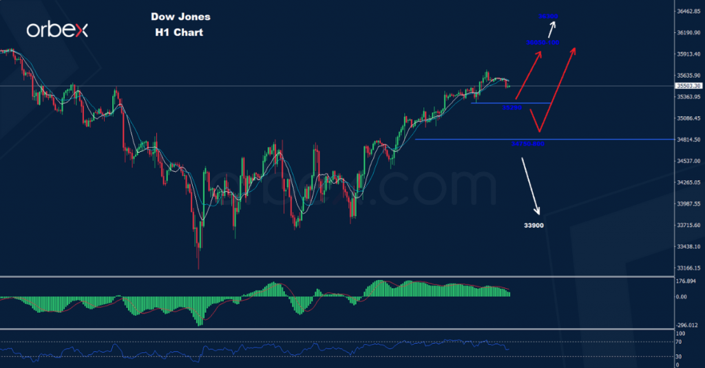 كما نرى على الرسم البياني للمدى اليومي، يواجه السوق الآن الدعم الأول حول 35290 حيث طالما استمر تداول السوق فوقه، فقد تستمر الموجة المتقدمة نحو المقاومة 100-36050.