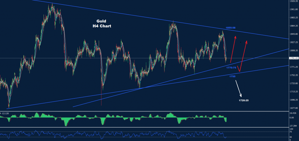 كما نرى في الرسم البياني السابق، فإن نظرتنا لا تزال هي نفسها طالما استمر تداول الذهب فوق مستويات الدعم لهذا المثلث التداولي ، وهو دعم 1770، فقد يحافظ السوق على فرص ارتفاع اخر  نحو المقاومة 58-1850.