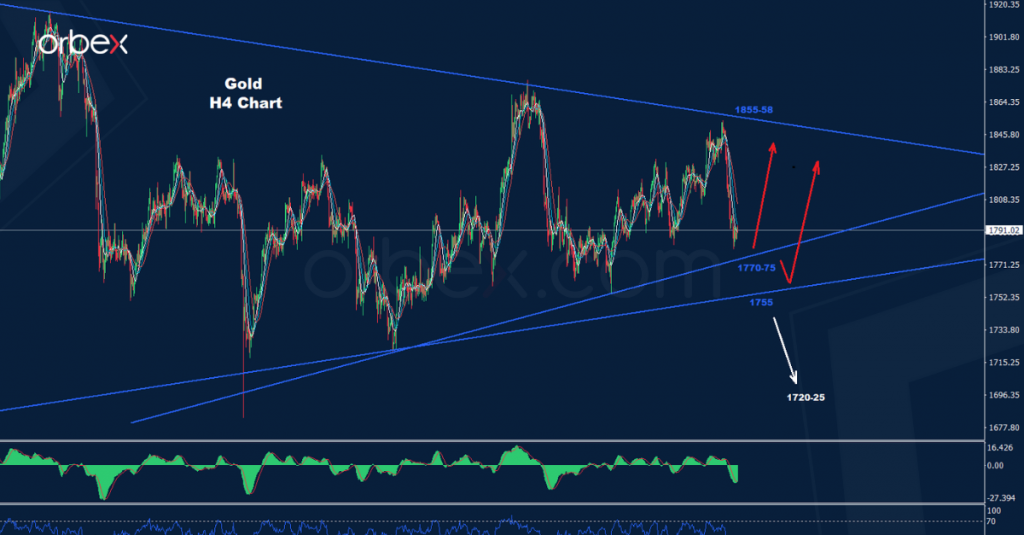 كما نرى في الرسم البياني السابق، فإن نظرتنا لا تزال هي نفسها طالما استمر تداول الذهب فوق مستويات الدعم لهذا المثلث التداولي، وهو دعم 1770، فقد يحافظ السوق على تقلب هذا التداول نحو المقاومة 58-1850.