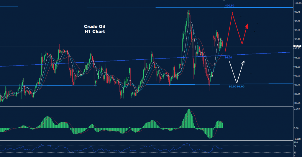 تحت 94.00 فإن منطقة التداول هذه قد تكبر باتجاه منطقة الدعم 90.00-91.00 والذي بدورة قد يدفع باتجاه تقدم آخر مرة أخرى.