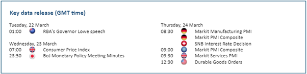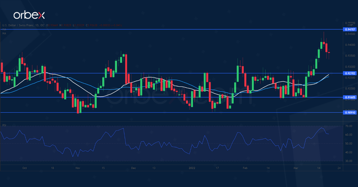 يرتفع الدولار الأمريكي مدعوماً بتباين السياسة النقدية المتزايد بين بنك الاحتياطي الفيدرالي والبنك الوطني السويسري. وتقلل حالة عدم اليقين في أوكرانيا من التوقعات الاقتصادية في منطقة اليورو، والتي تعد أكبر سوق تصدير لسويسرا. وقد ارتفع مؤشر أسعار المستهلكين في سويسرا بنسبة ٢.٢٪ “فقط” في فبراير، وهو رقم تحسد عليه من جيرانها. وبذلك فإن البنك الوطني السويسري ليس في عجلة من أمره للتخلي عن نهجه شديد التيسير. بل إن البنك المركزي قد يستمر في التدخل لكبح ارتفاع الفرنك في وقت تزيد فيه الأعمال العدائية الطلب على أصول الملاذ الآمن. وقد وصل الزوج إلى أعلى مستوى له في ١٢ شهراً عند ٠.٩٤٧٠، ويزيد الاختراق من الارتفاع ليصل بالزوج صوب ٠.٩٧٠٠. أما المستوى ٠.٩٢٧٠، فيعد مستوى دعم جديد.