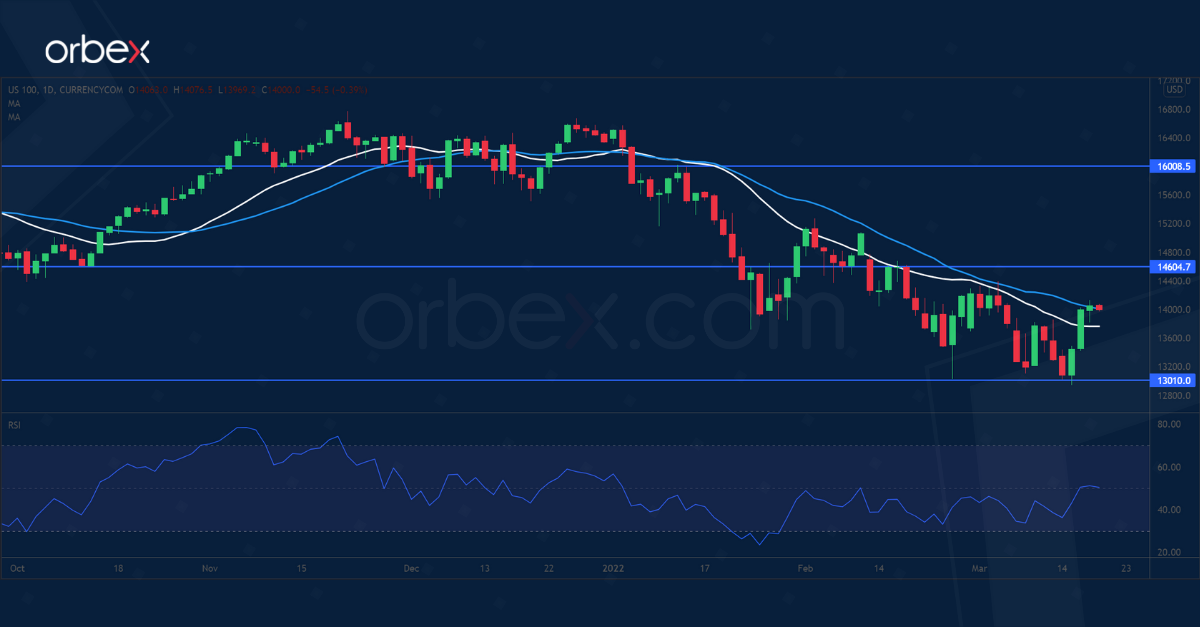 ارتد مؤشر “ناسداك ١٠٠” مرة أخرى وسط تحسن المعنويات. وقد رفع بنك الاحتياطي الفيدرالي أسعار الفائدة على النحو الذي كان متوقعاً له على نطاق واسع، وأصدر توقعات متشددة بشكل مفاجئ ضمن خطته لرفع الفائدة. وعلى الرغم من حالة عدم الاستقرار العالمي، فيمكن النظر إلى خطوة صانعي السياسات المتخمة بالثقة على أنها تأتي ضمن تفاؤلهم وتصميمهم على محاربة التضخم. وفي الشرق، أثارت الدلائل المتقطعة على التسوية بين موسكو وكييف الأمل في تحقيق اختراق محتمل. وفي الوقت نفسه، فإن تعهد الصين بالمزيد من التحفيز الاقتصادي ودعم سوق العقارات المتعثر يخفف من الحالة المزاجية للسوق. وارتد المؤشر عن أدنى مستوياته في مايو ٢٠٢١ عند ١٣٠٠٠. ويمثل المستوى ١٤٦٠٠ العقبة الأولى المقبلة.
