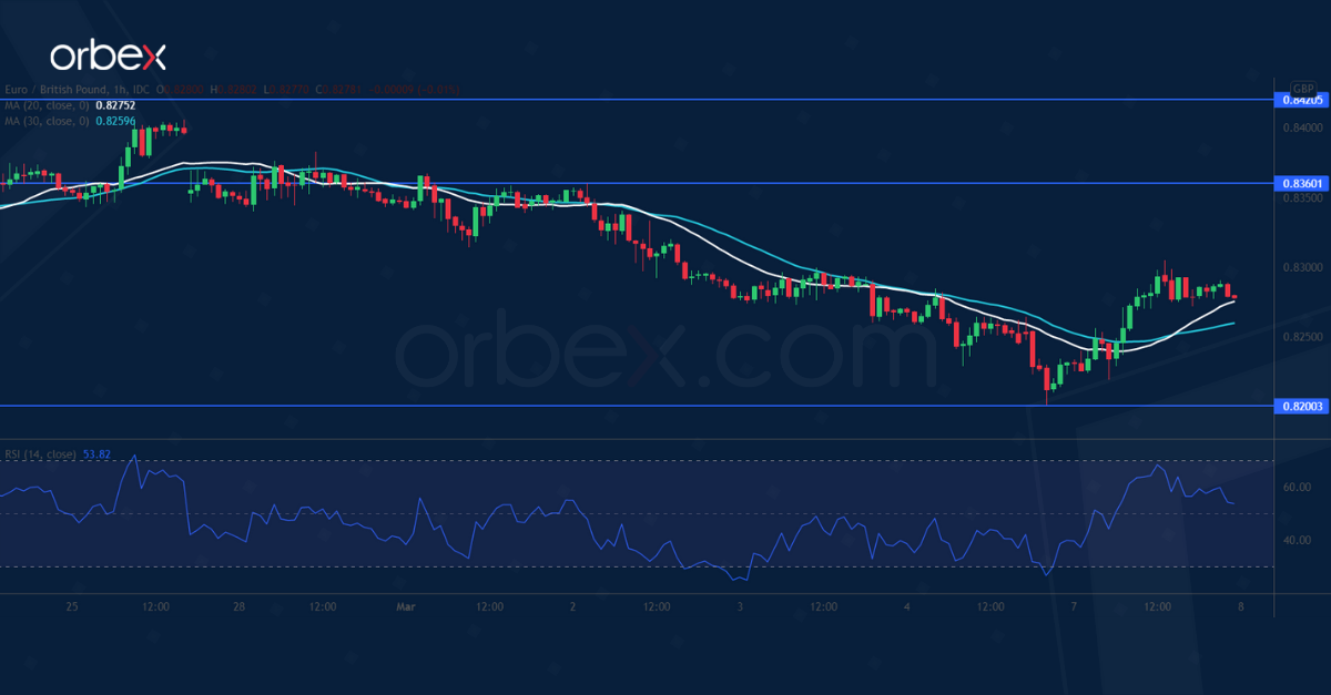 يعوض اليورو خسائره بفضل عملية تغطية قصيرة الأجل قبيل اجتماع البنك المركزي الأوروبي. بيد أن انخفاض الزوج أدنى الدعم الرئيسي على الرسم البياني اليومي عند السعر ٠.٨٢٨٠ يزيد من الضغط على المعنويات.