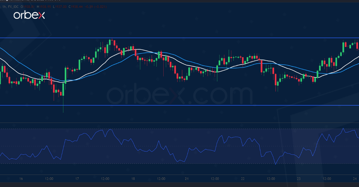 يرتفع الذهب وسط تجدد الطلب على المعدن بوصفه ملاذ آمن. وشهدت حركة السعر دعماً قوياً على المستوى النفسي ١٩٠٠، والذي يقع عند قاعدة ارتفاع مارس وعلى المتوسط المتحرك لمدة ٣٠ يوماً، مما يجعله منطقة ازدحام.