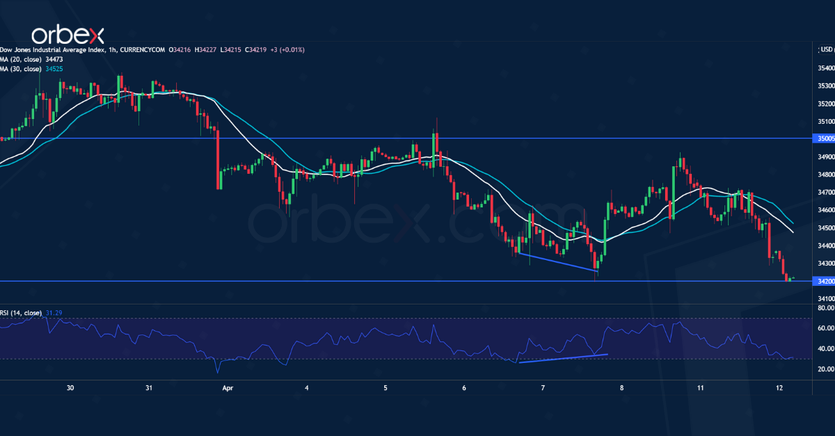 هبط مؤشر “داو جونز 30” بفعل استمرار ارتفاع عائدات سندات الخزانة الأمريكية. وكان قد وجد المؤشر دعماً مؤقتاً فوق المتوسط المتحرك لمدة 30 يوماً (34200).